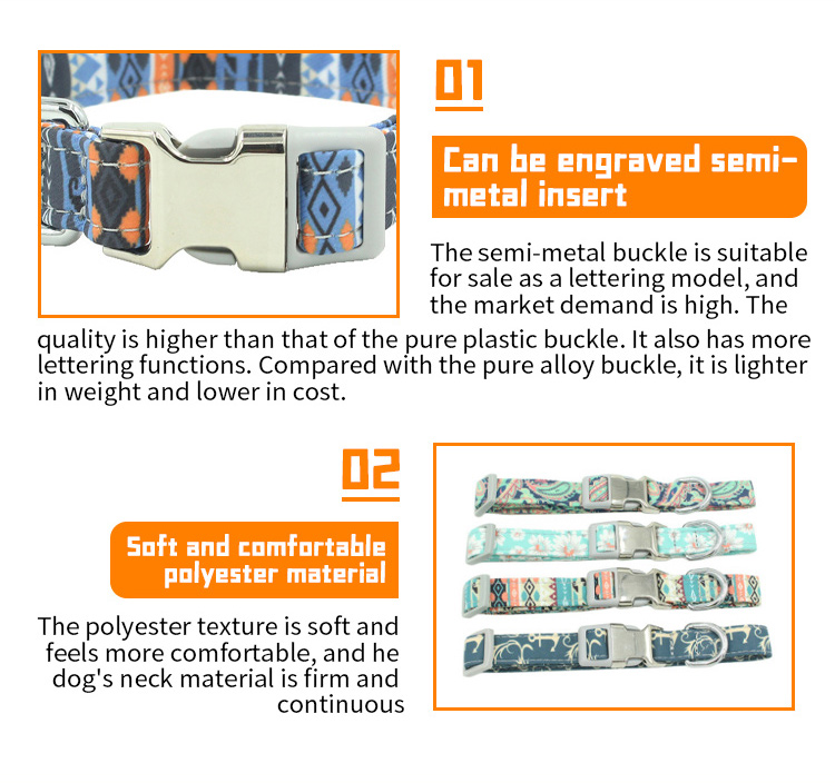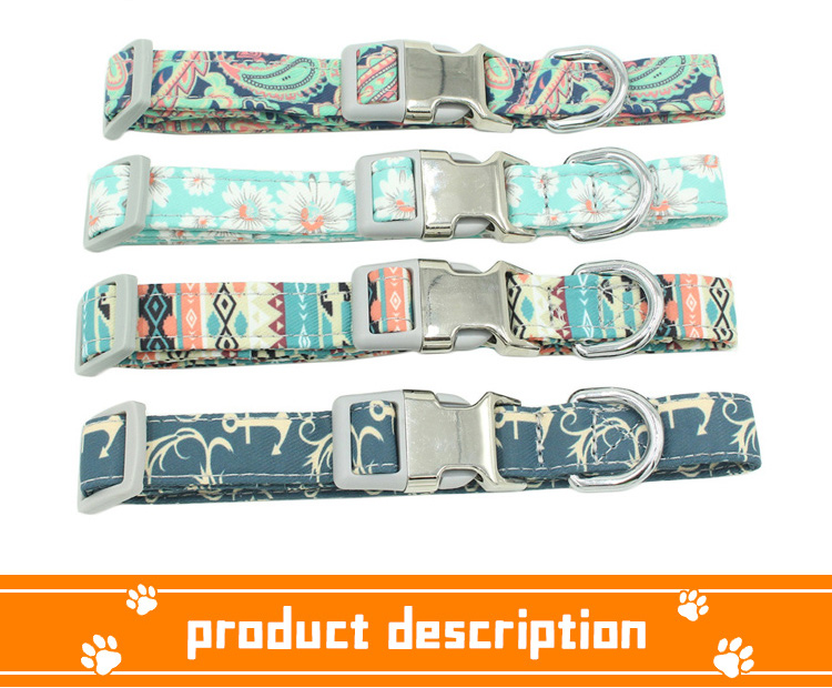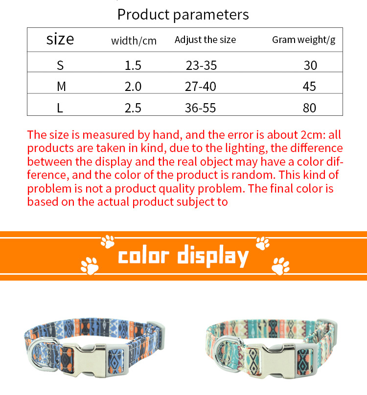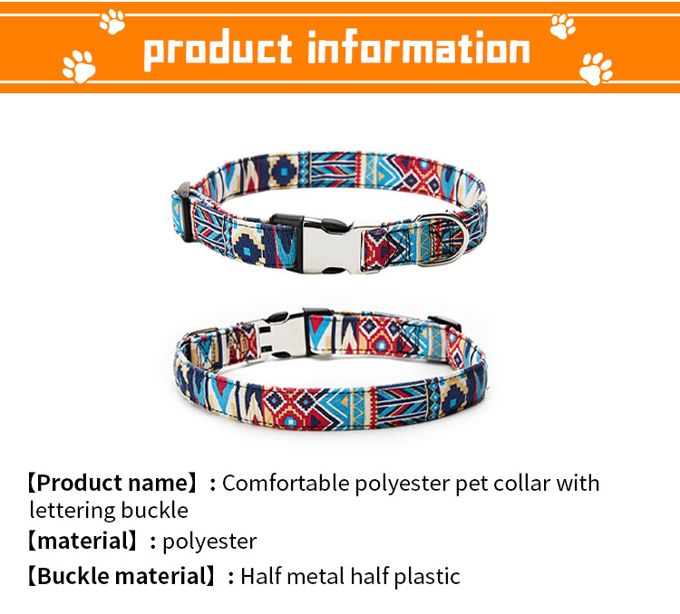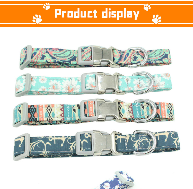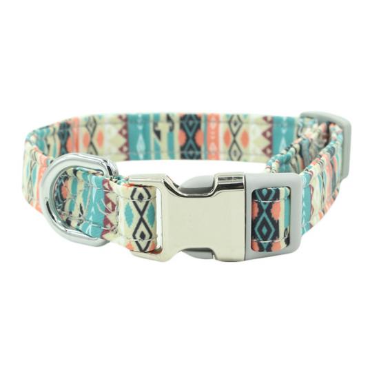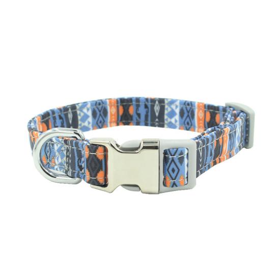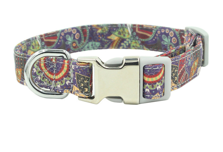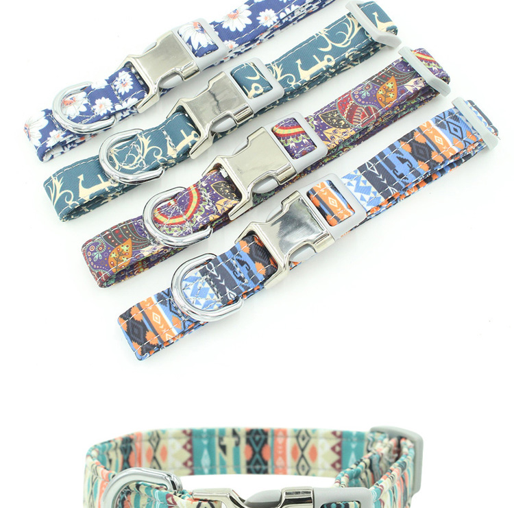 This adjustable ethnic style printed dog collar is made of high-quality wear-resistant nylon webbing, featuring unique bohemian-style patterns that are stylish and eye-catching. The heavy-duty quick release buckle ensures secure fastening and one-hand easy operation, while the fully adjustable design fits small and medium dogs comfortably. The reinforced metal D-ring provides a reliable attachment point for leashes and ID tags, perfect for daily walking, outdoor activities and photo shoots. Available in multiple vibrant pattern options to match different styles. Support custom size, pattern, logo and wholesale orders.