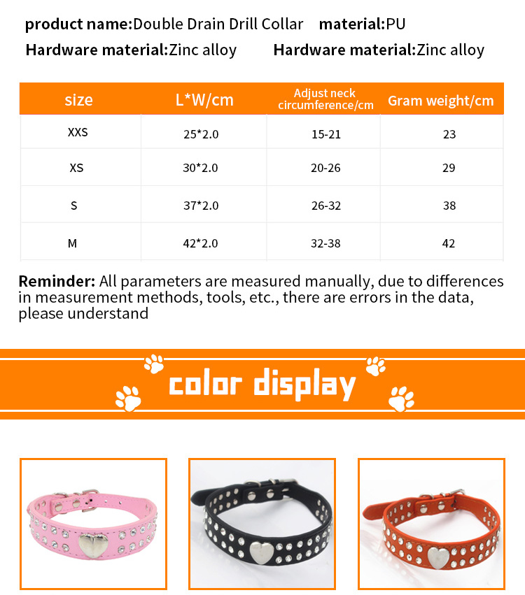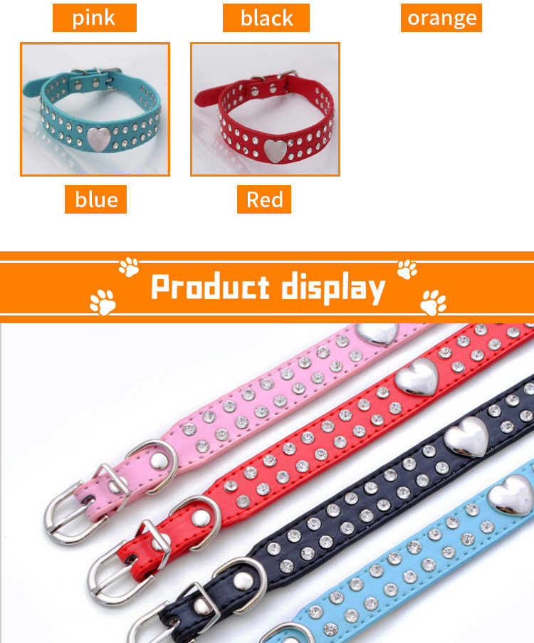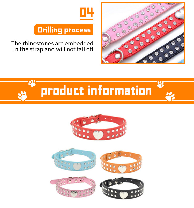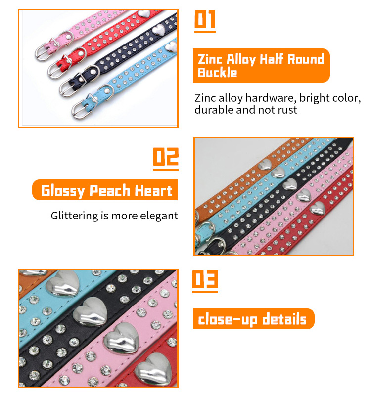 This adjustable heart studded faux leather dog collar is made of high-quality soft faux leather, decorated with heart-shaped rivets and studs for a cute, stylish design. The adjustable design fits small and medium dogs comfortably, while the heavy-duty quick release buckle ensures secure fastening and easy operation. The soft inner lining prevents chafing and irritation on your dog's neck, ensuring all-day comfort. The reinforced metal D-ring provides a reliable attachment point for leashes and ID tags, perfect for daily walking, outdoor activities and photo shoots. Available in multiple vibrant colors to match different styles. Support custom size, color, logo and wholesale orders.