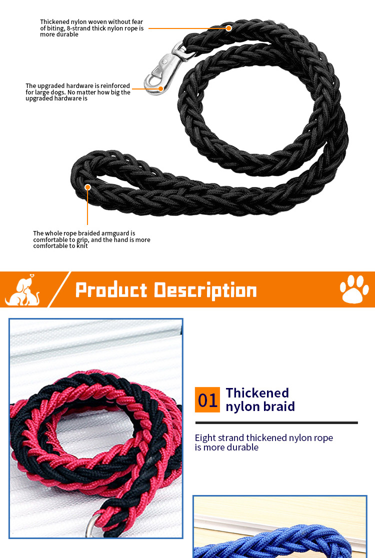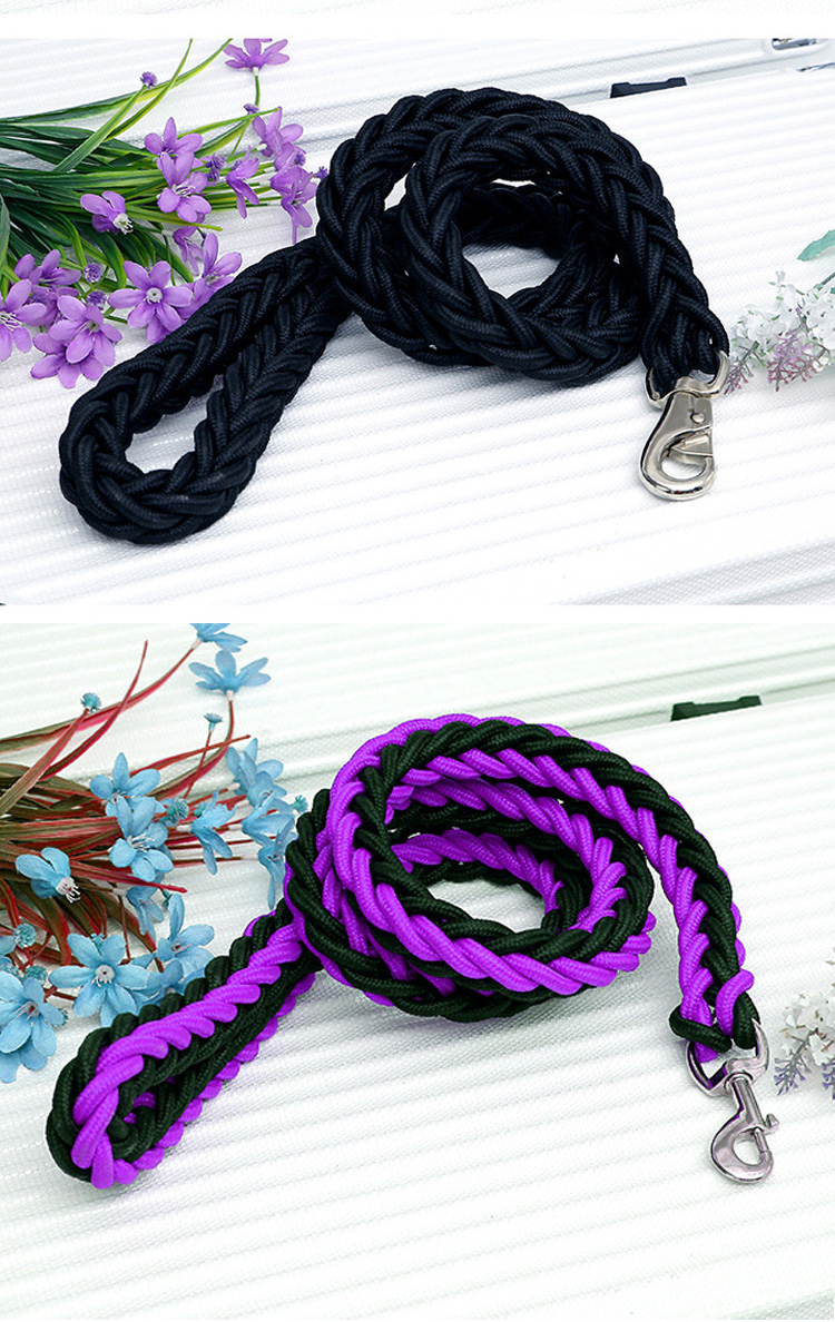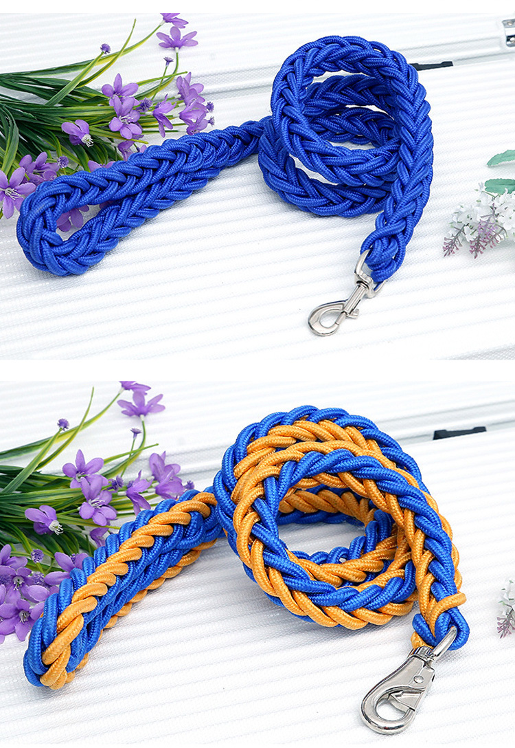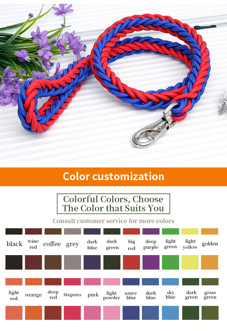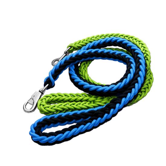 This blue green braided round rope dog leash is made of high-tensile, wear-resistant nylon, featuring a tight braided construction that resists fraying and breaking. The vibrant blue-green color block design is stylish and eye-catching, while the heavy-duty swivel metal clasp prevents tangling and ensures a secure attachment to your dog's collar or harness. The soft round rope is comfortable to hold and gentle on your hands, reducing fatigue during long walks. Perfect for daily walking, training, hiking and other outdoor activities, especially for medium and large dogs with strong pulling habits. Support custom size, color, logo and wholesale orders.
