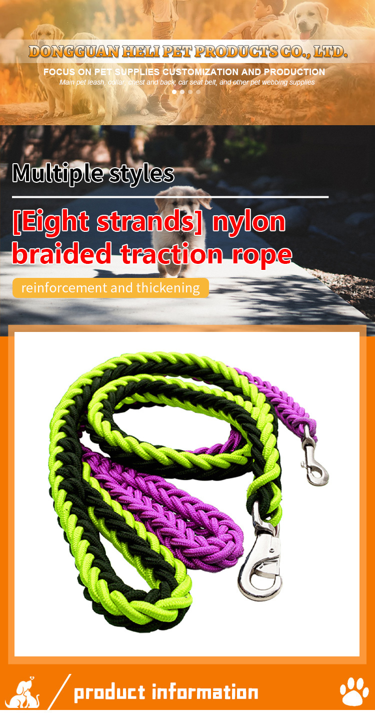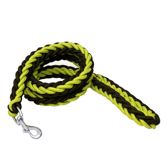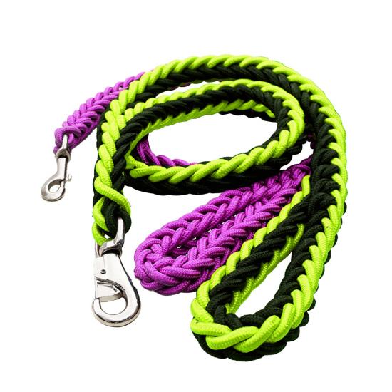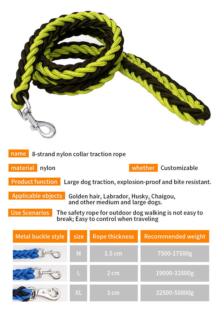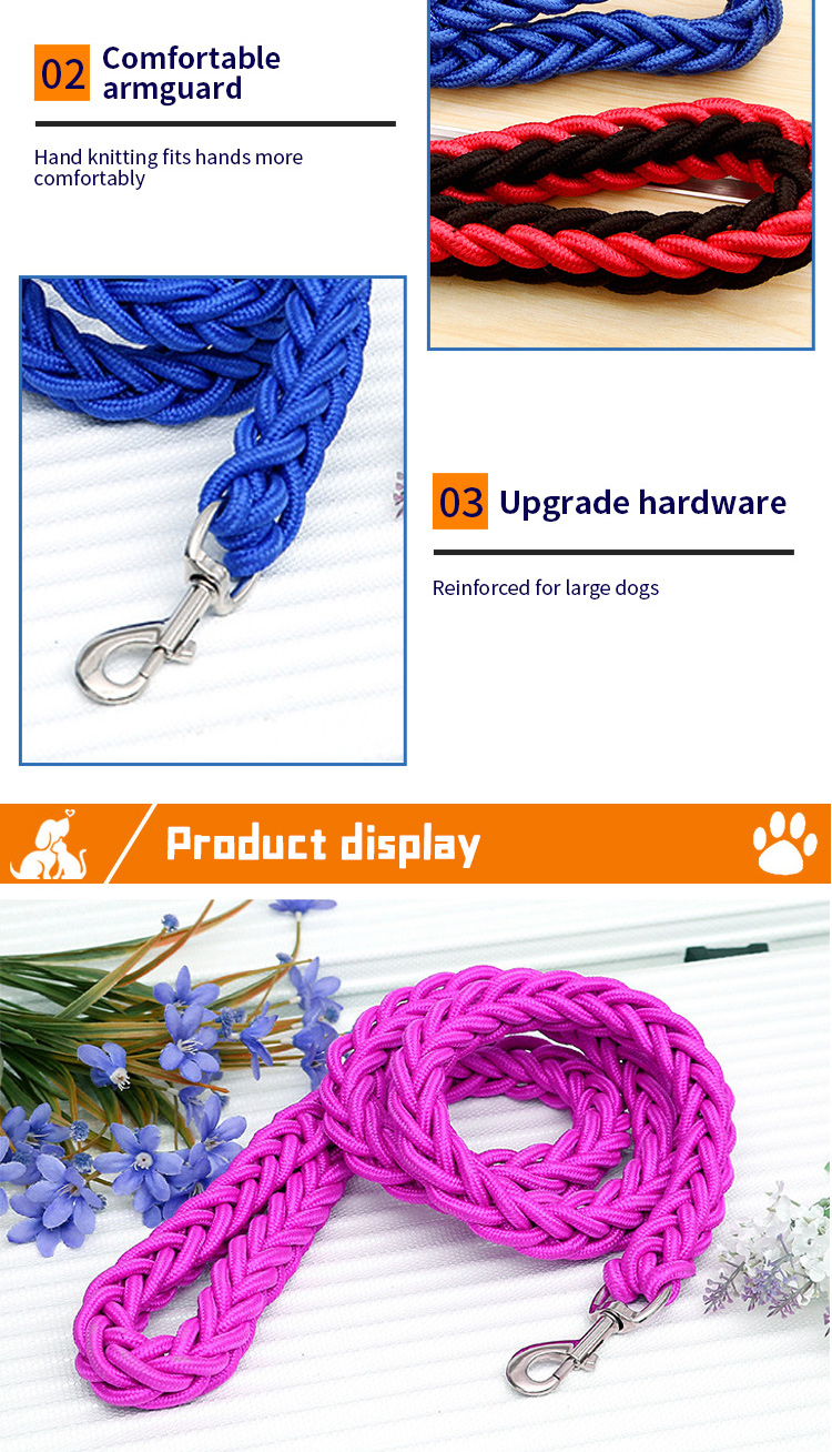 This blue green braided round rope dog leash is made of high-tensile, wear-resistant nylon, featuring a tight braided construction that resists fraying and breaking. The vibrant blue-green color block design is stylish and eye-catching, while the heavy-duty swivel metal clasp prevents tangling and ensures a secure attachment to your dog's collar or harness. The soft round rope is comfortable to hold and gentle on your hands, reducing fatigue during long walks. Perfect for daily walking, training, hiking and other outdoor activities, especially for medium and large dogs with strong pulling habits. Support custom size, color, logo and wholesale orders.