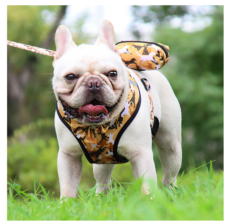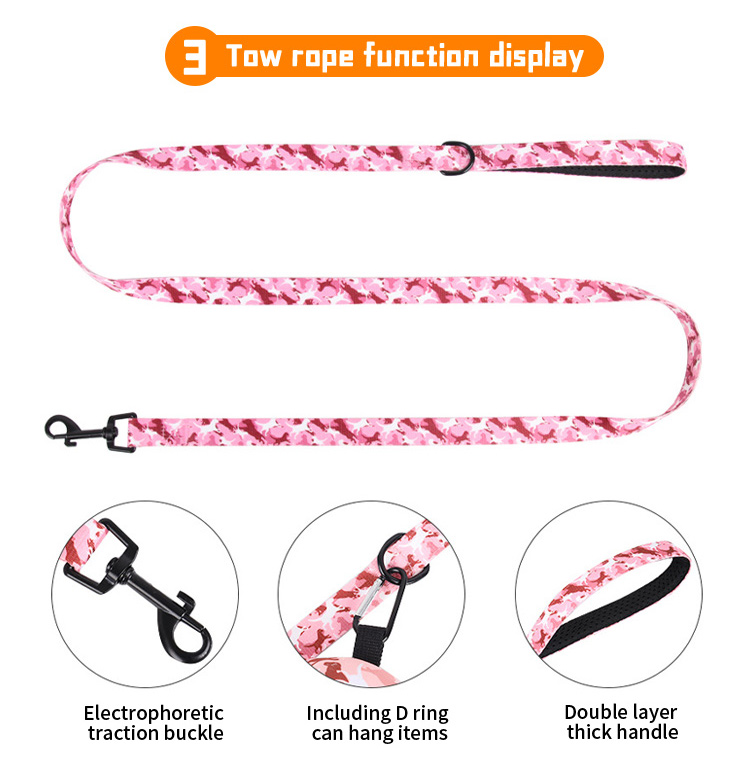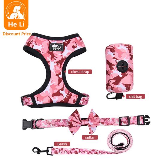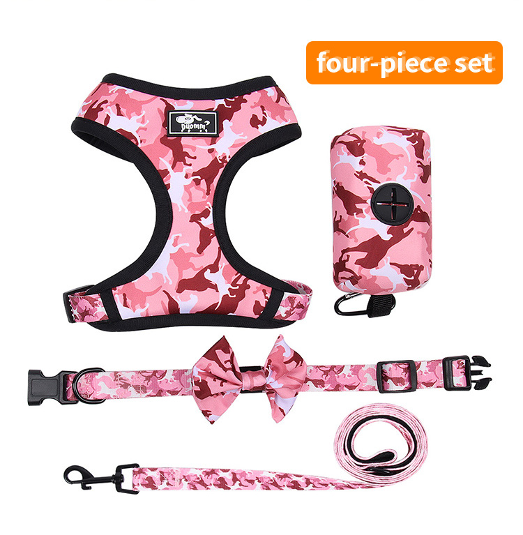 This 4 in 1 pink floral dog harness set is a complete, stylish walking solution for small dogs and puppies. The set includes a breathable mesh vest harness, adjustable bowtie collar, matching leash, and portable poop bag dispenser, all with a soft pink floral print for a cute, elegant look. Made of lightweight, skin-friendly fabric, it ensures all-day comfort without chafing, while the quick-release buckle allows for easy on/off. Perfect for daily walks, photo shoots, holiday gifts and special occasions. Support custom pattern, logo and wholesale orders.