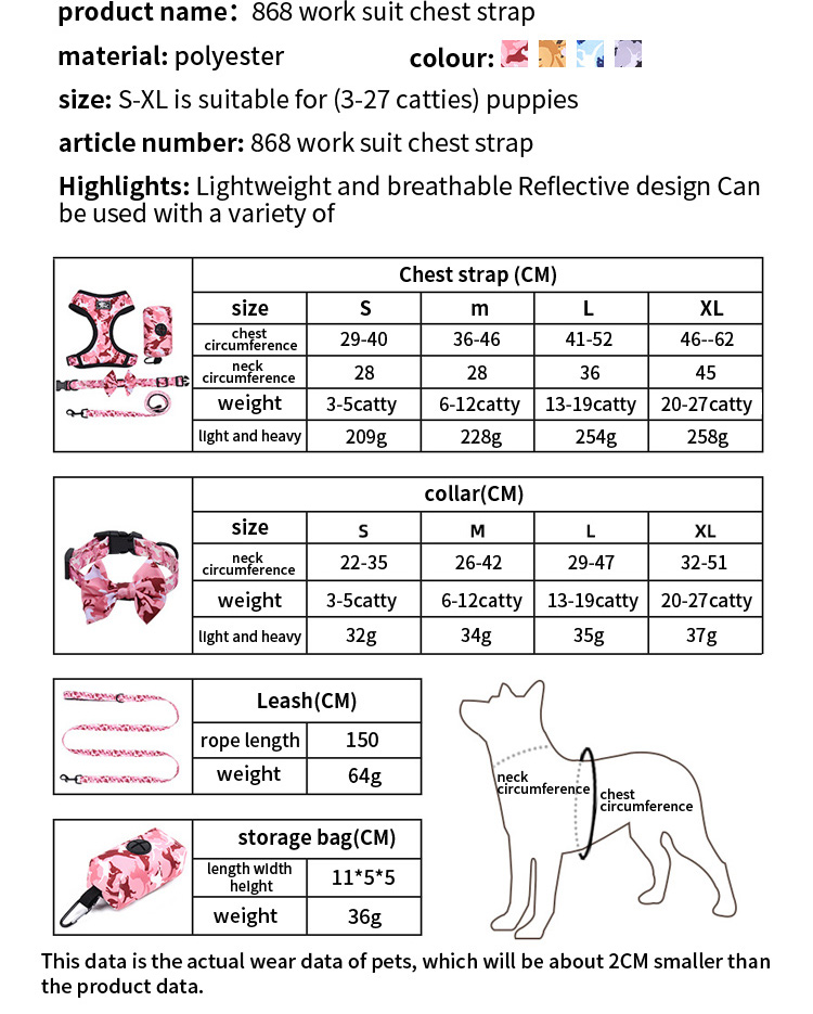 /Cute Pink Floral Dog Harness Set, 4 in 1 Bowtie Pet Harness Collar Leash with Poop Bag Dispenser for Small Dogs