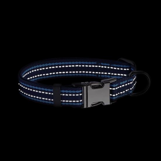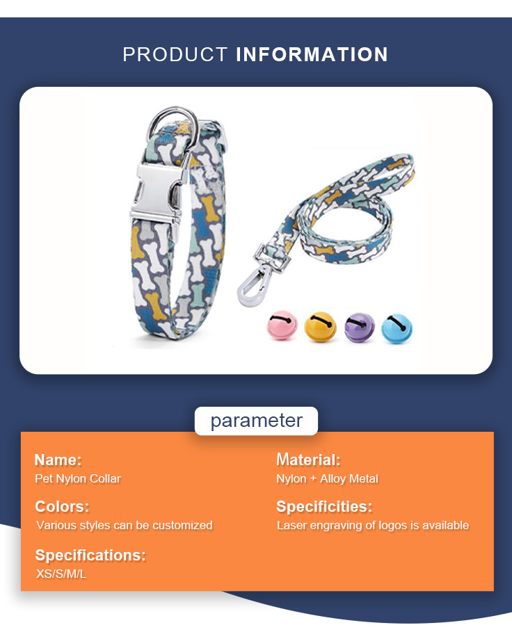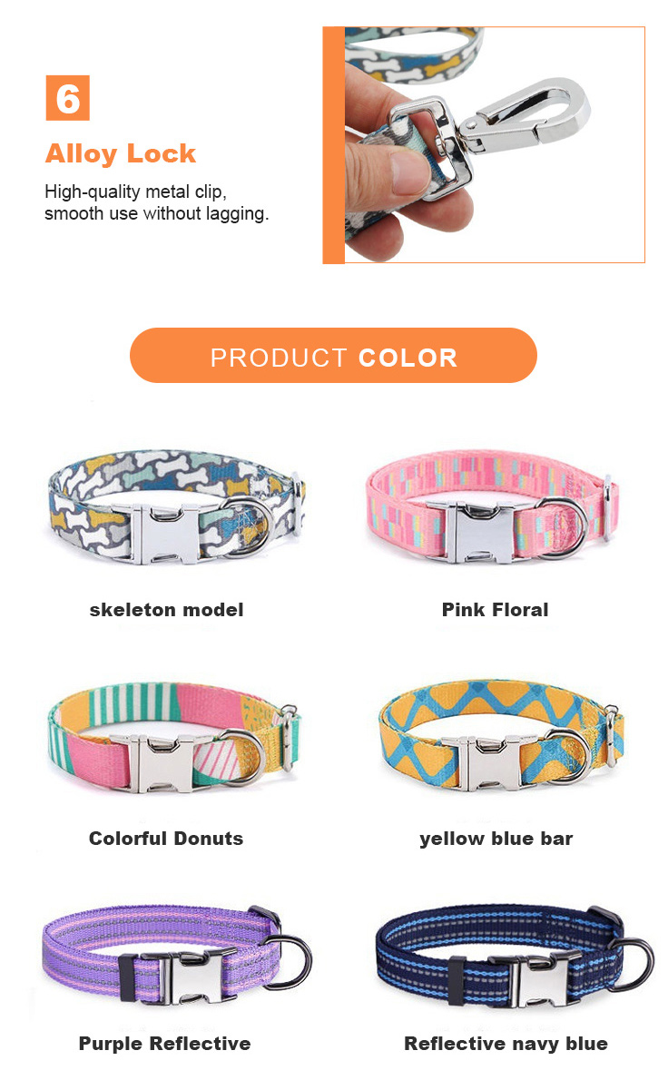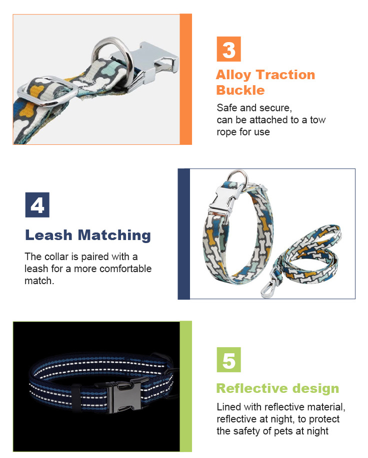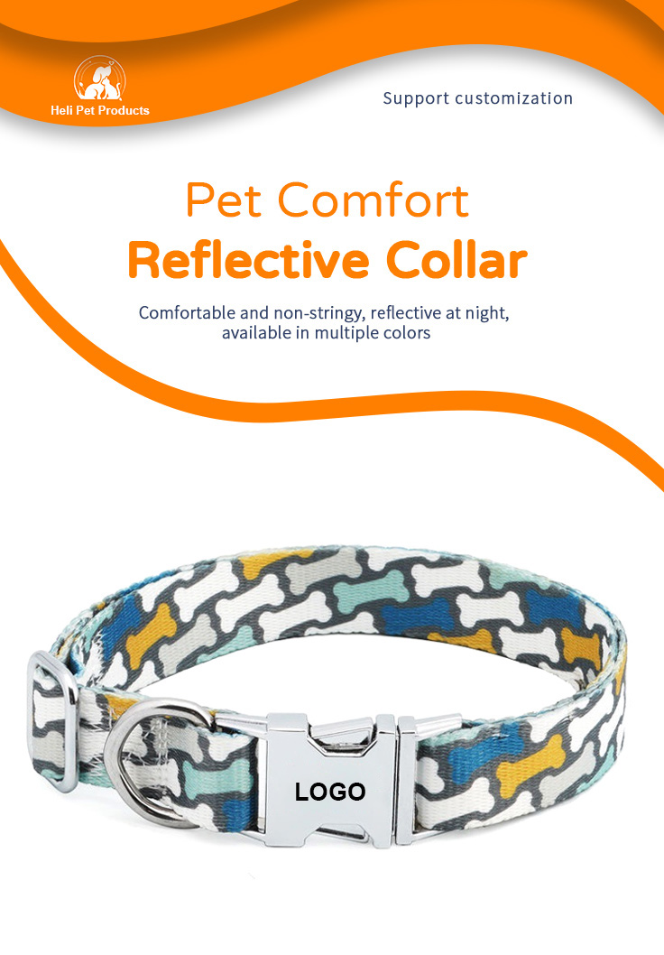 Fashionable reflective nylon dog collar with customizable color, pattern and logo options. Soft padded design ensures all-day comfort for your pet, while high-visibility reflective strips keep them safe during night walks. Adjustable size fits small, medium and large dogs, perfect for daily walking and outdoor activities. Support OEM & wholesale orders.