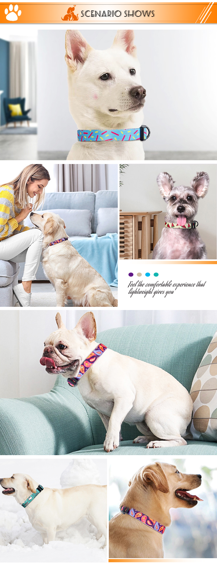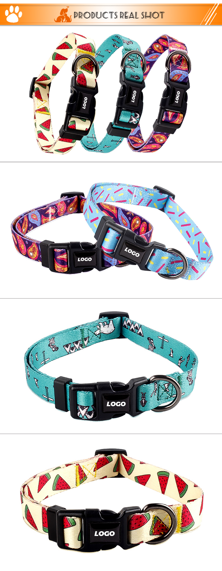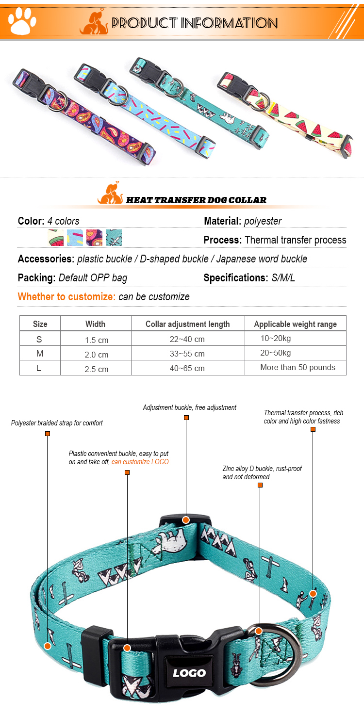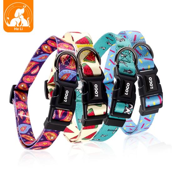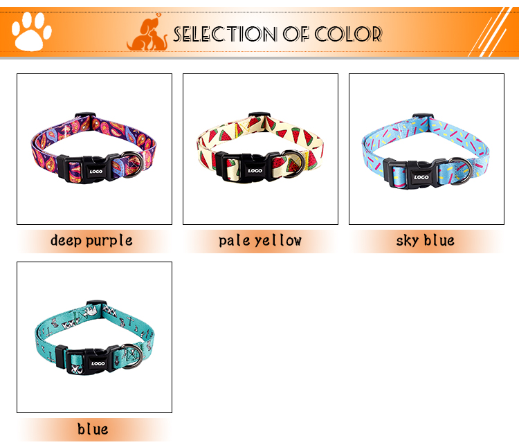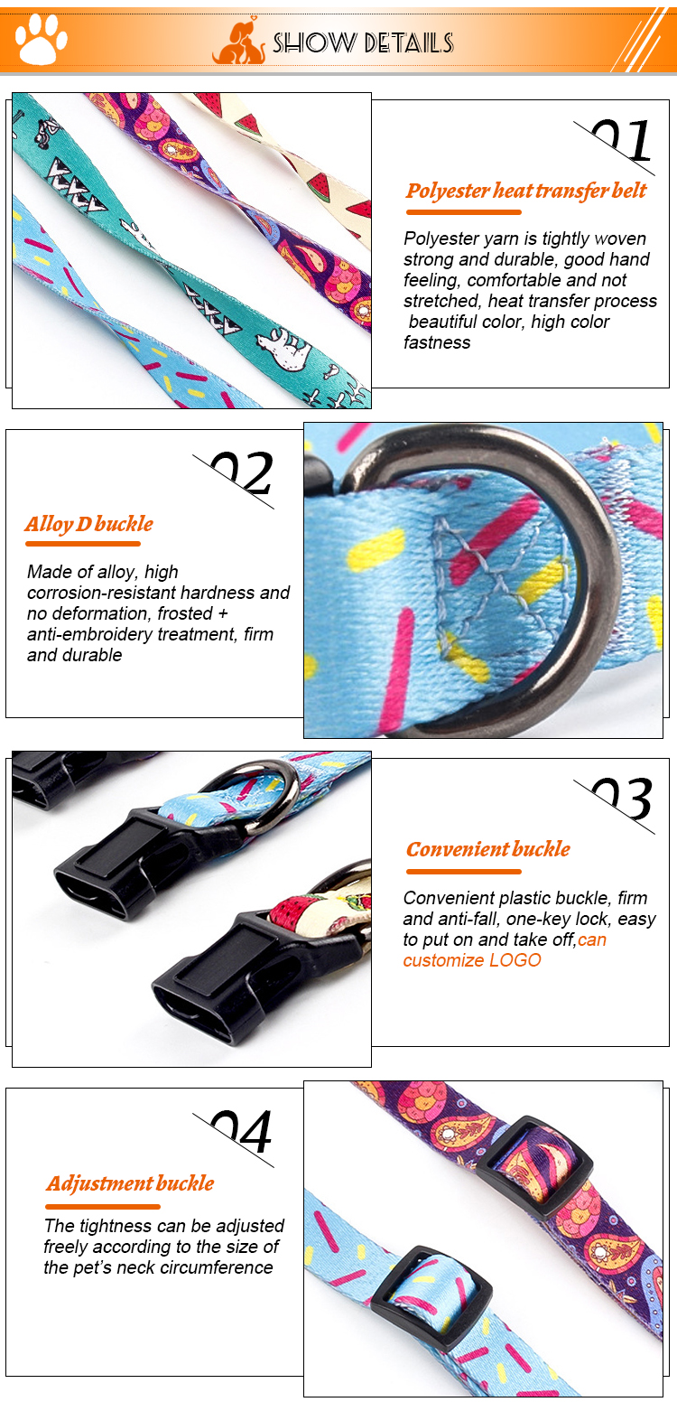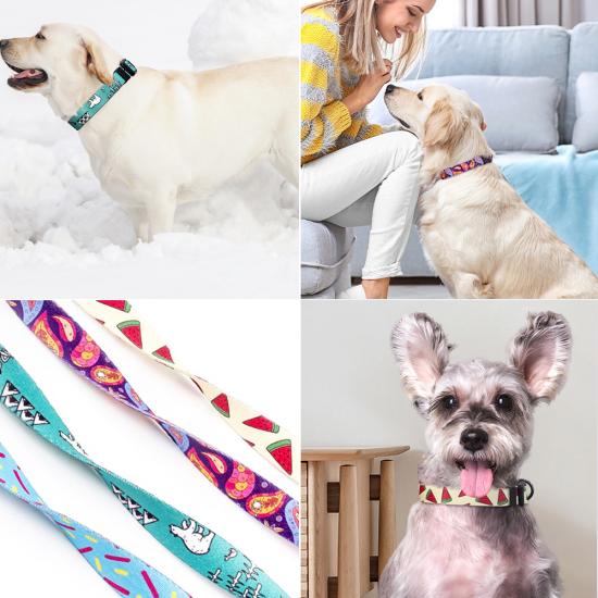 This fashion printed dog collar features vibrant, unique patterns (watermelon, turquoise, purple galaxy) to make your pet stand out. Made of soft, durable nylon webbing, it ensures all-day comfort without chafing. The adjustable size fits small, medium and large dogs, while the quick-release plastic buckle allows for easy on/off. Perfect for daily wear, photo shoots and special occasions. Support custom logo and wholesale orders.