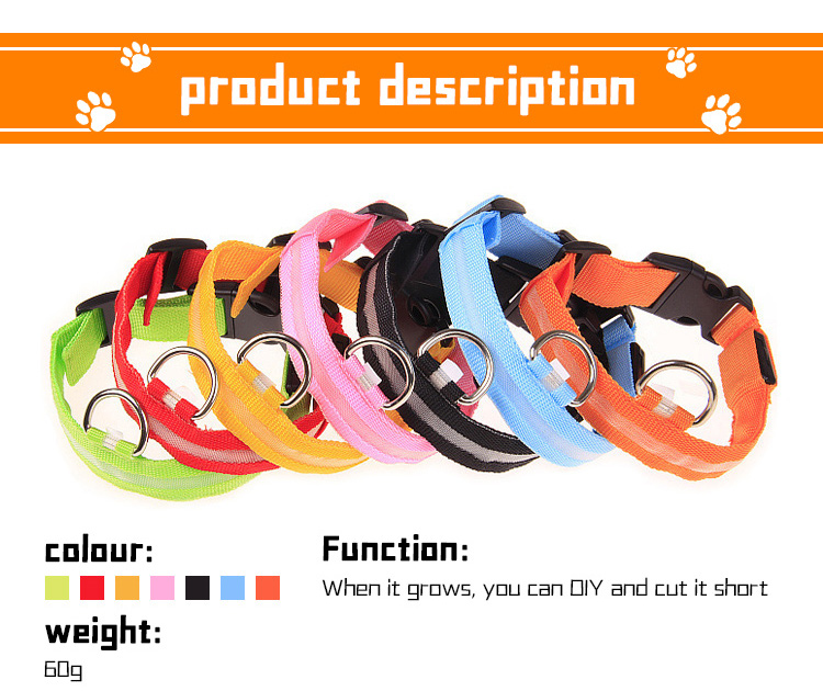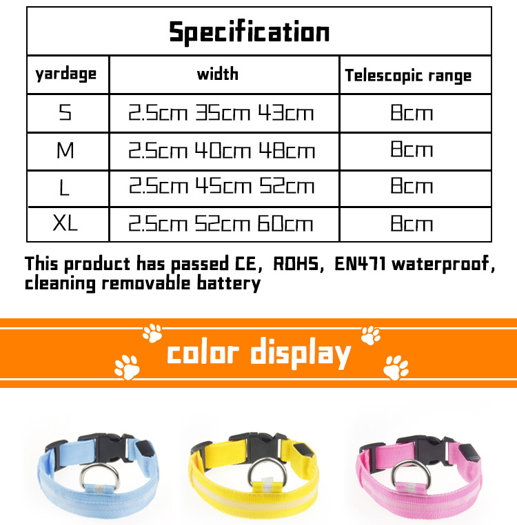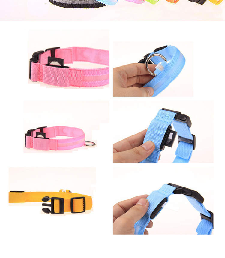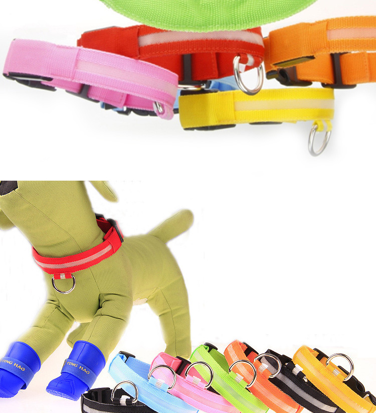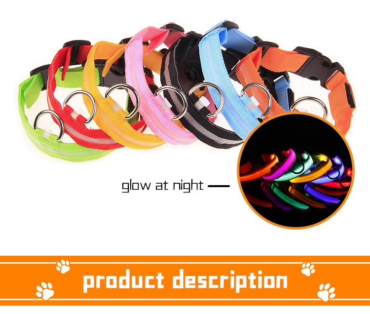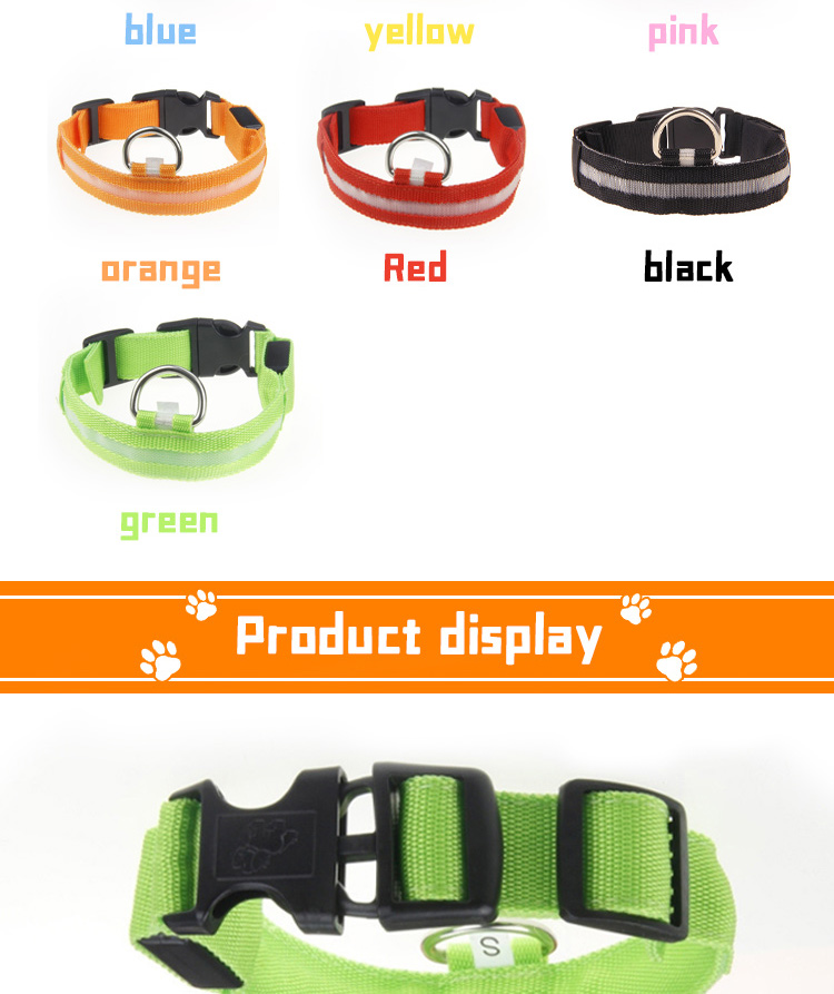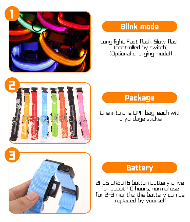 LED glowing nylon dog collar with bright, long-lasting light modes (steady flash/strobe). Soft webbing and adjustable design ensure all-day comfort for your pet. High-visibility reflective strips and custom logo/color options make it both safe and stylish. Perfect for night walking, training and outdoor activities. Support OEM & wholesale orders.