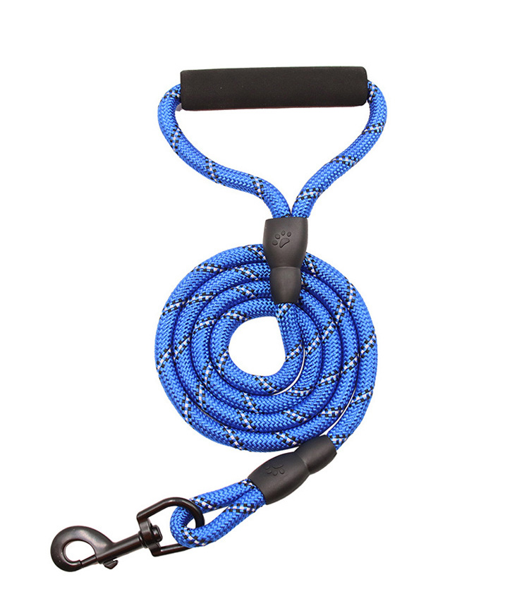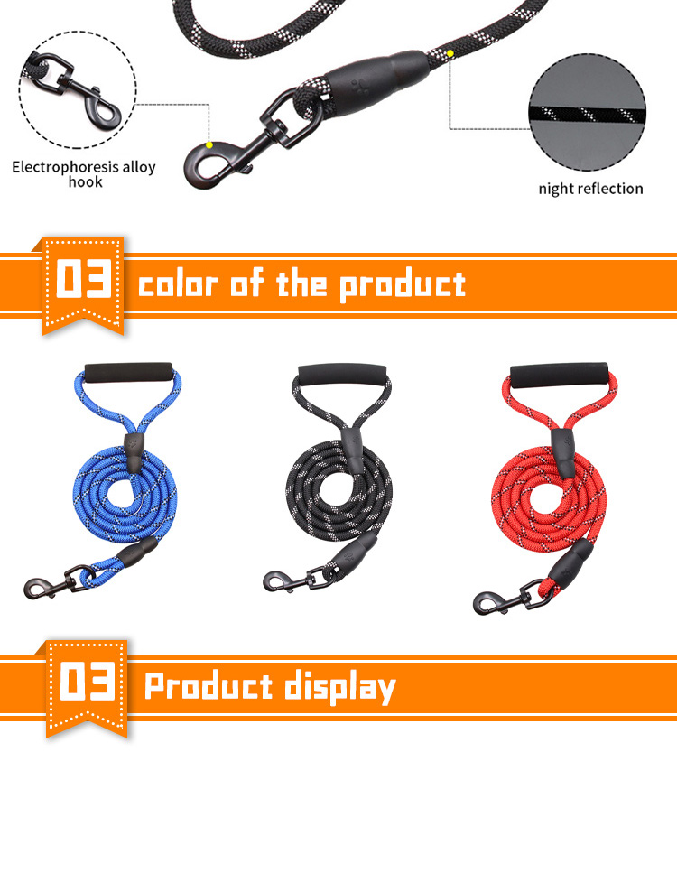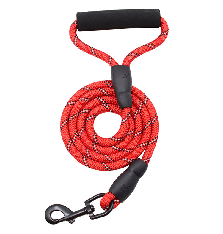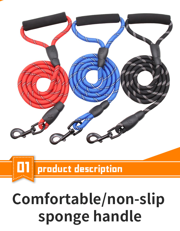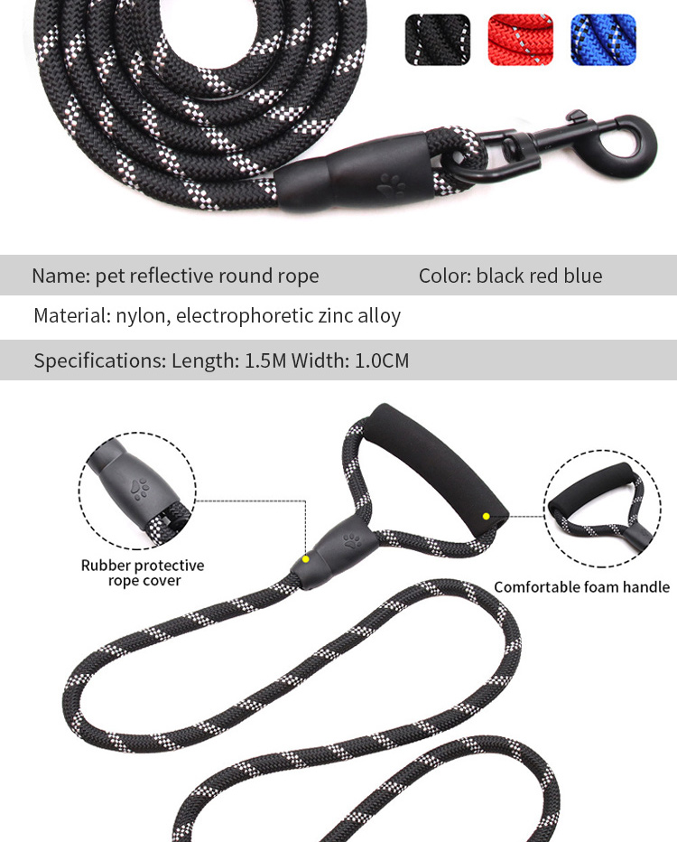 This multi-color padded handle round rope dog leash is made of high-tensile, wear-resistant nylon, featuring a tight braided round rope construction that resists fraying and breaking. The soft foam padded handle ensures a comfortable, non-slip grip, reducing hand fatigue during long walks. The heavy-duty swivel metal clasp prevents tangling and ensures a secure attachment to your dog's collar or harness, perfect for medium and large dogs, especially those with strong pulling habits. Available in 3 classic color options (red, blue, black) to suit different styles, ideal for daily walking, training, hiking and outdoor activities. Support custom size, color, logo and wholesale orders.