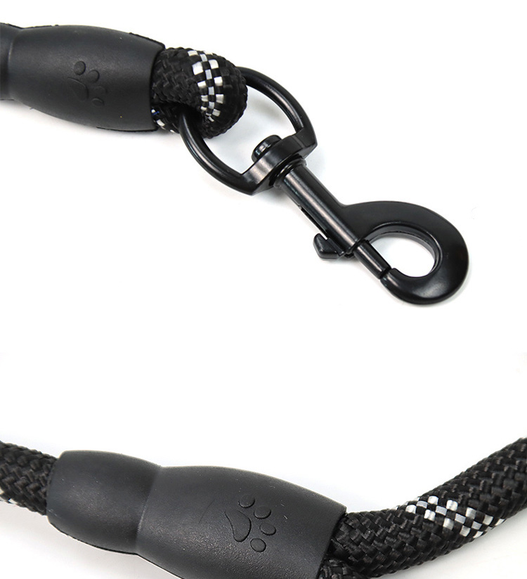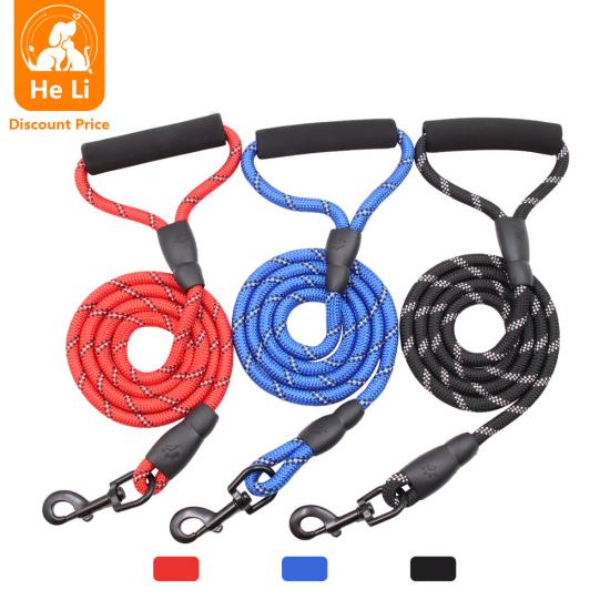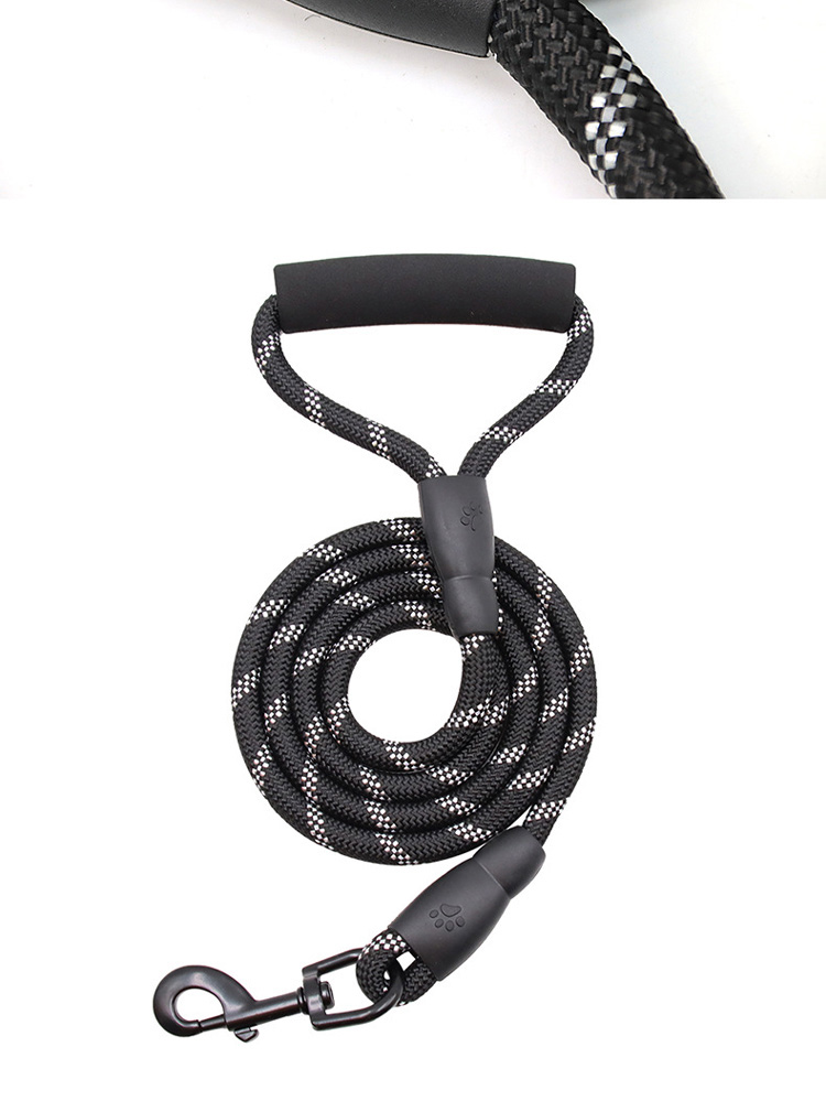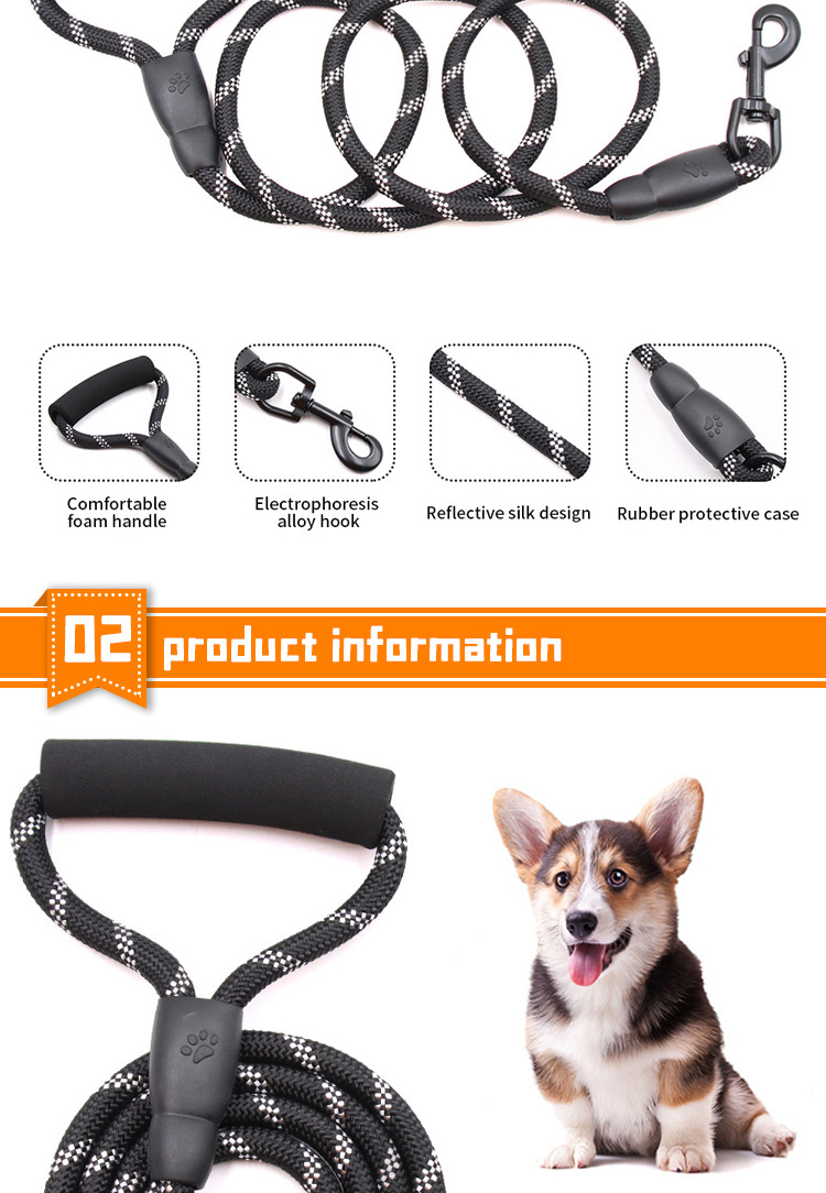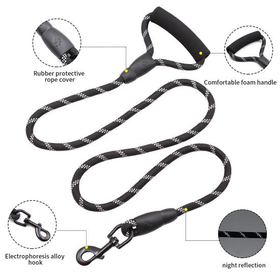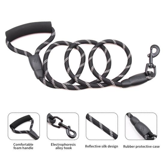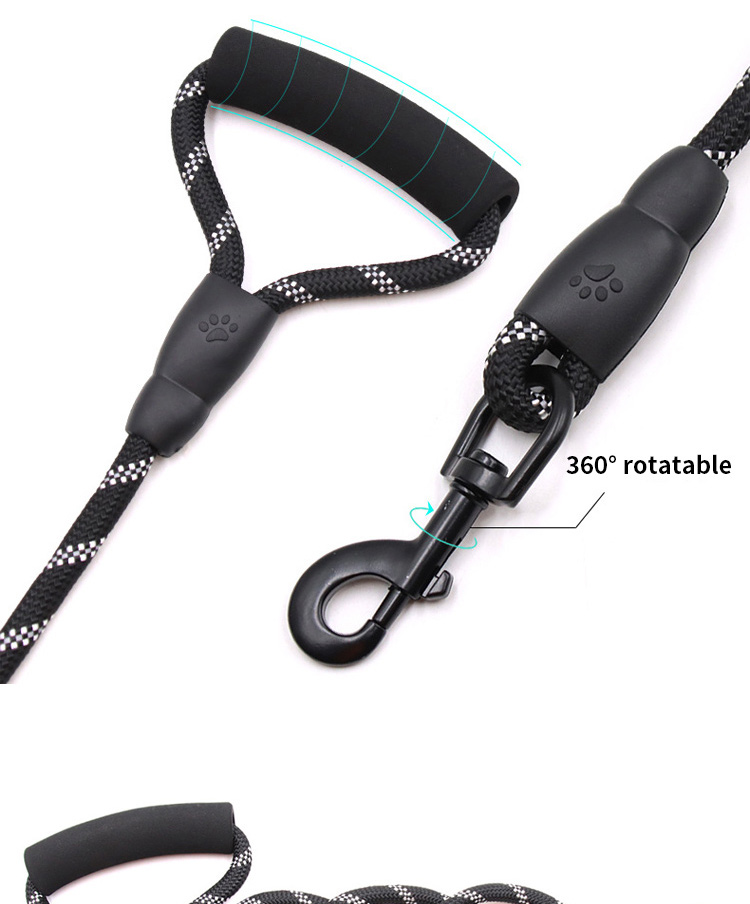 This multi-color padded handle round rope dog leash is made of high-tensile, wear-resistant nylon, featuring a tight braided round rope construction that resists fraying and breaking. The soft foam padded handle ensures a comfortable, non-slip grip, reducing hand fatigue during long walks. The heavy-duty swivel metal clasp prevents tangling and ensures a secure attachment to your dog's collar or harness, perfect for medium and large dogs, especially those with strong pulling habits. Available in 3 classic color options (red, blue, black) to suit different styles, ideal for daily walking, training, hiking and outdoor activities. Support custom size, color, logo and wholesale orders.