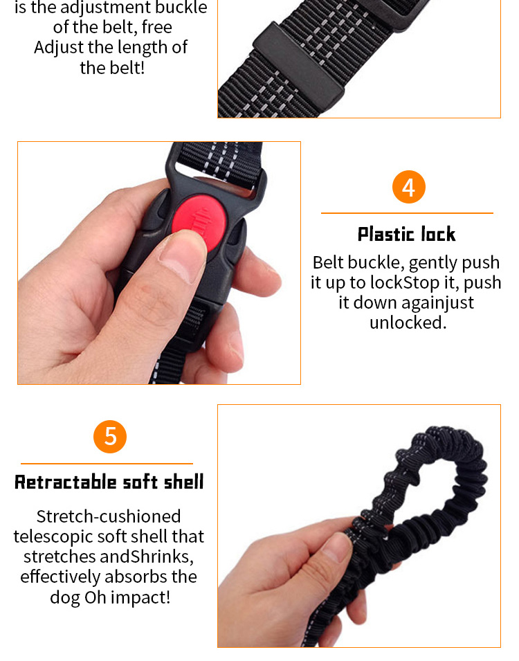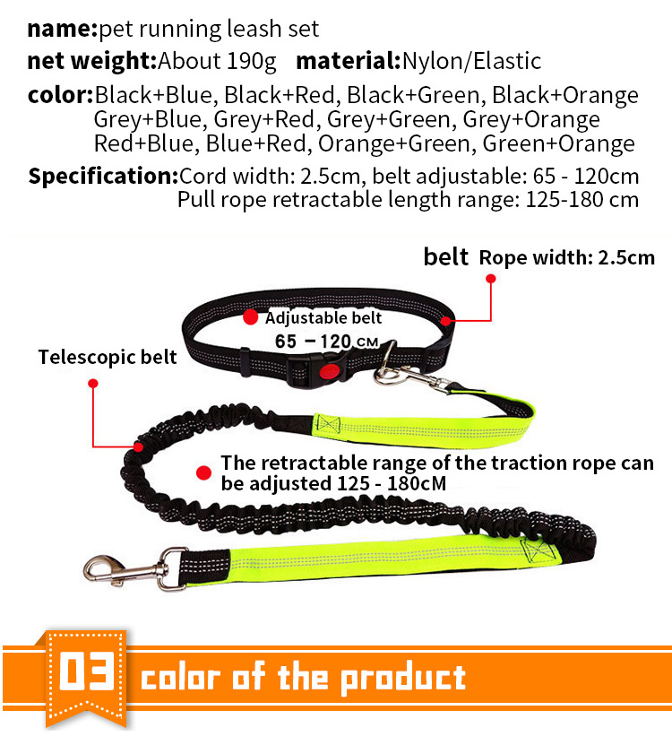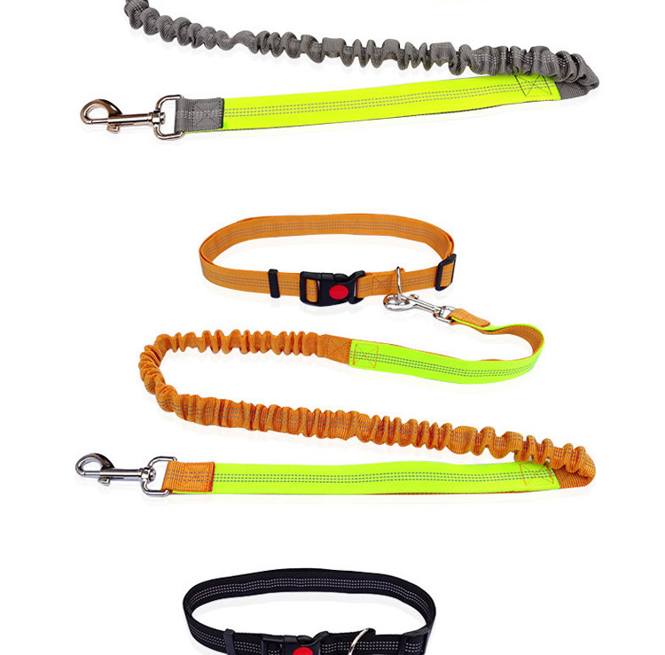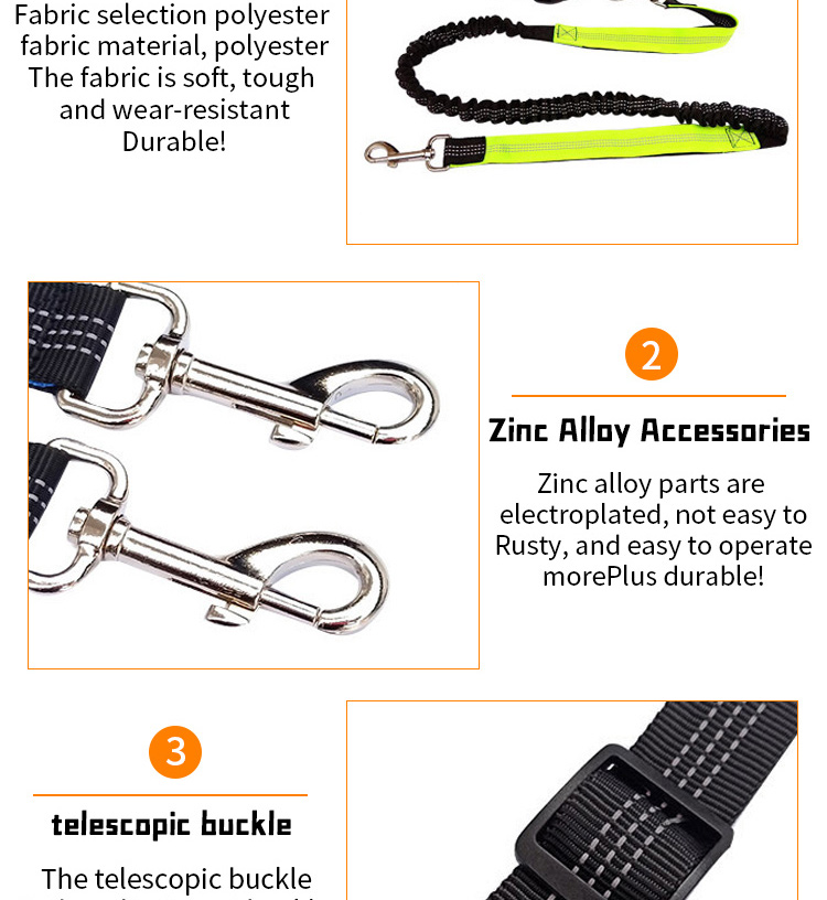 This multi-color shock absorbing dog leash set is made of high-tensile, wear-resistant nylon webbing, featuring a built-in elastic buffer to absorb sudden pulling impact, effectively reducing strain on both you and your pet. The soft padded handle ensures a comfortable, non-slip grip, reducing hand fatigue during long walks. The heavy-duty swivel metal clasp prevents tangling and ensures a secure attachment to your dog's collar or harness, perfect for medium and large dogs, especially those with strong pulling habits. Available in 4 vibrant color options (blue, green, orange, red) to suit different styles, ideal for daily walking, training and outdoor activities. Support custom size, color, logo and wholesale orders.