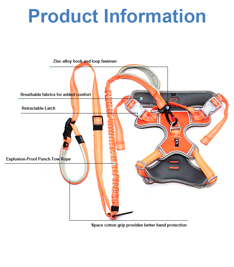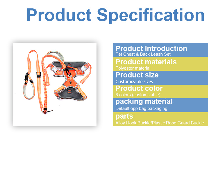 This no pull shock absorbing dog harness and leash set is made of high-tensile, wear-resistant nylon webbing, with a thick padded inner layer to protect your dog's chest from chafing. The ergonomic no-pull design distributes pressure evenly, effectively preventing pulling and choking, perfect for medium and large dogs. The built-in elastic buffer on the leash absorbs sudden pulling impact, reducing strain on both you and your pet. The reflective stitching ensures high visibility during night walks, and the heavy-duty metal clasp ensures secure attachment. Ideal for daily walking, training, hiking and outdoor activities. Support custom size, color, logo and wholesale orders.