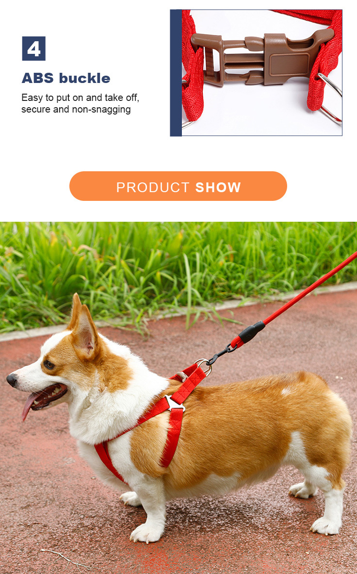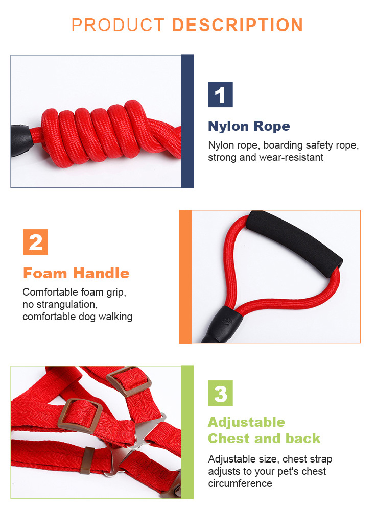 This red no pull dog harness and leash set is made of high-tensile, wear-resistant nylon webbing, with a thick padded inner layer to protect your dog's chest from chafing. The ergonomic no-pull design distributes pressure evenly, effectively preventing pulling and choking, perfect for medium and large dogs. The matching leash features a soft padded handle for a non-slip, comfortable grip during long walks, and the heavy-duty metal clasp ensures secure attachment. The adjustable straps ensure a perfect, comfortable fit, ideal for daily walking, training, hiking and outdoor activities. Support custom size, color, logo and wholesale orders.