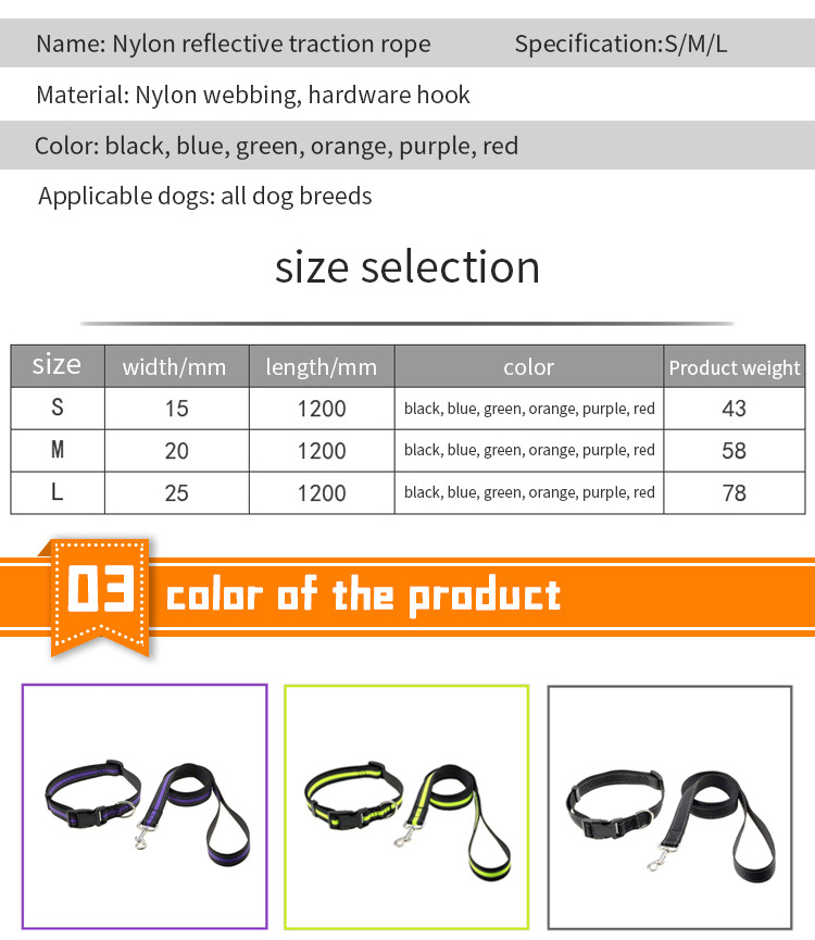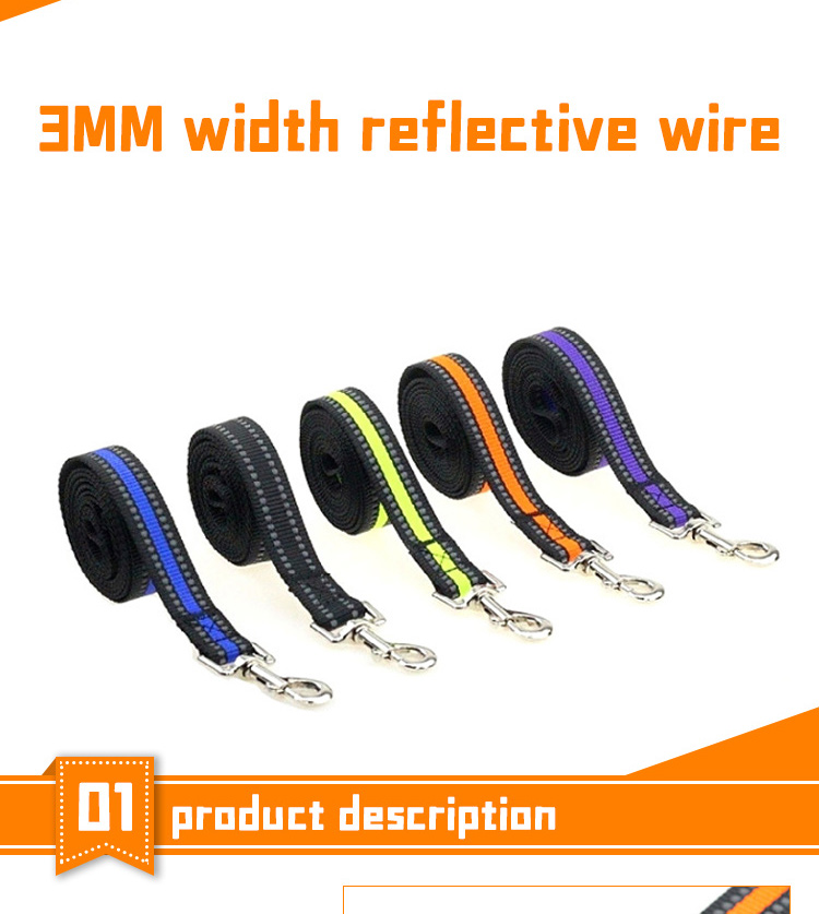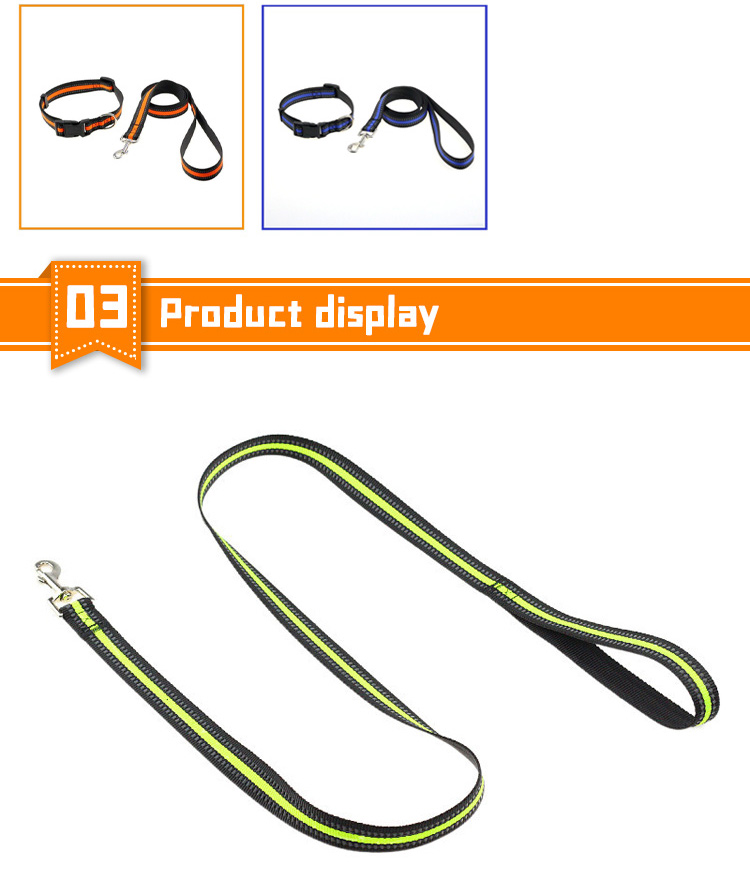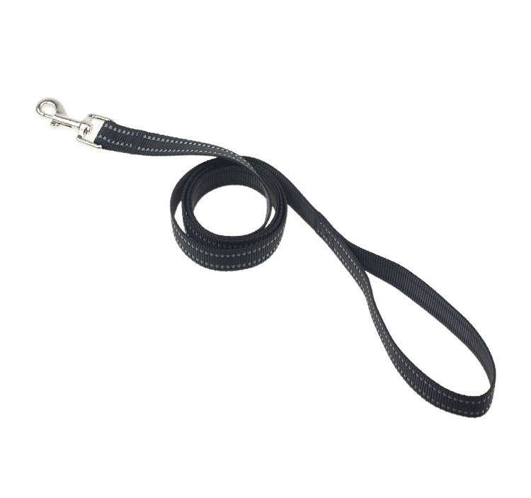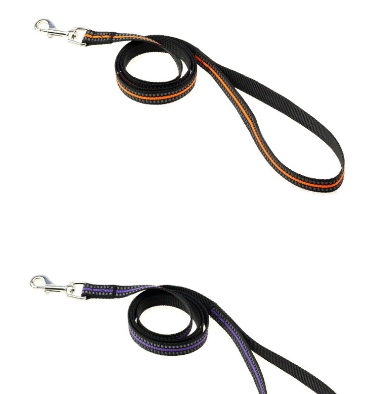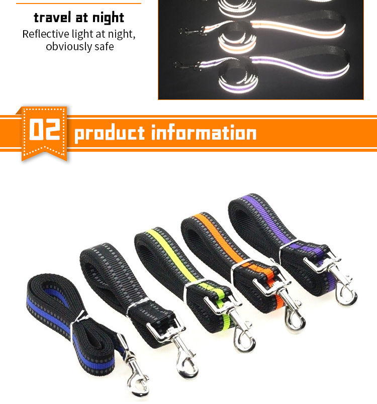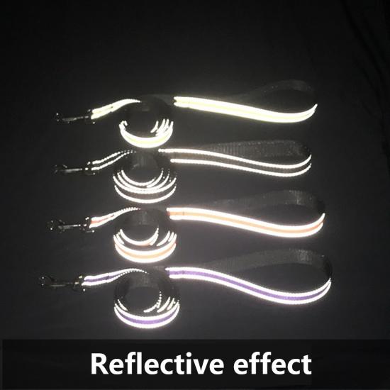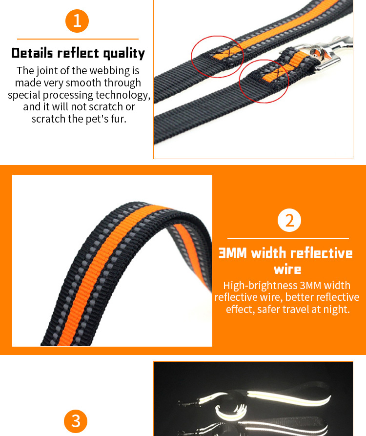 This reflective dog leash is made of high-tensile, wear-resistant nylon webbing, embedded with high-intensity reflective threads that glow brightly under low light or at night, ensuring maximum visibility and safety for you and your pet during evening walks. The soft padded handle provides a comfortable, non-slip grip, reducing hand fatigue during long walks. The heavy-duty swivel metal clasp prevents tangling and ensures a secure attachment to your dog's collar or harness, suitable for small, medium and large dogs. Ideal for daily walking, training and outdoor activities, especially for night use. Support custom size, color, logo and wholesale orders.