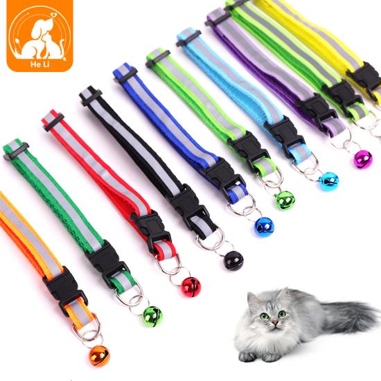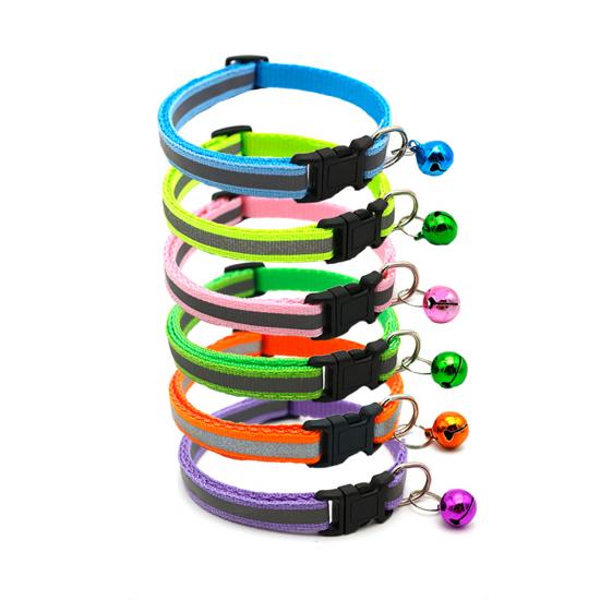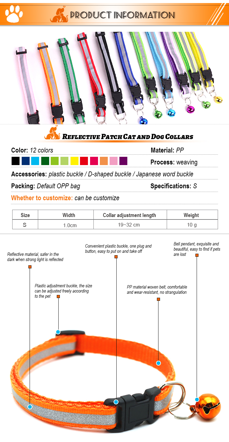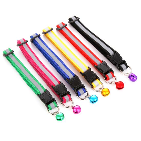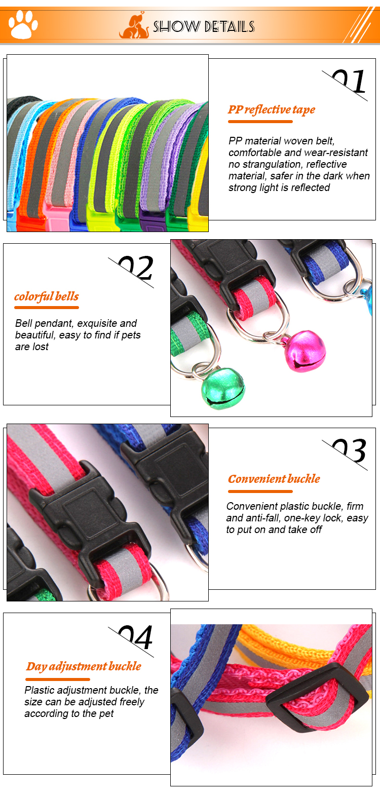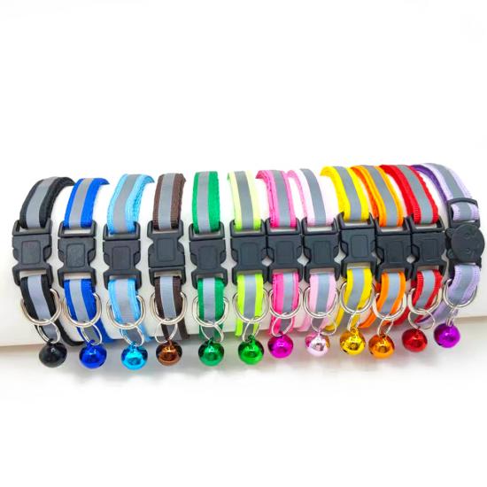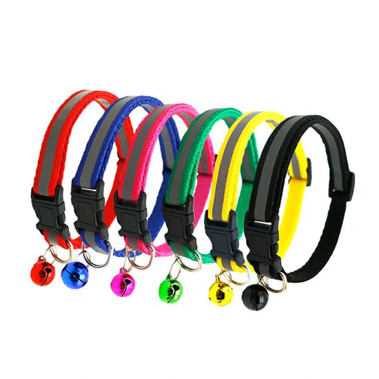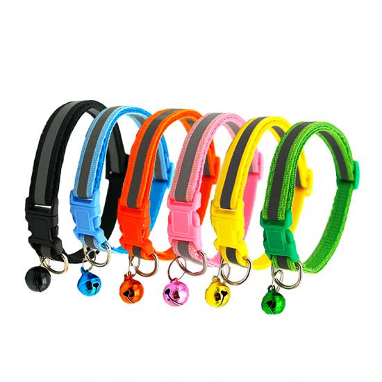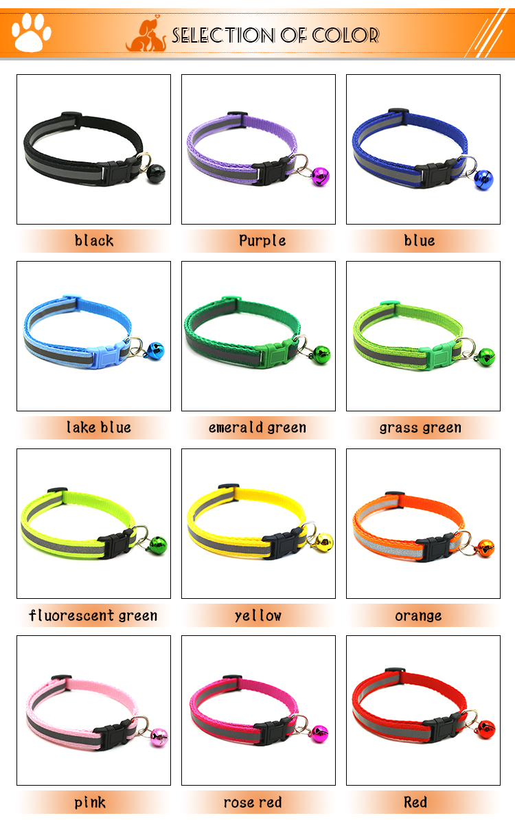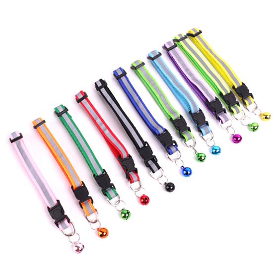 This reflective nylon dog collar with bell is made of high-quality wear-resistant nylon webbing, with a high-visibility reflective strip to ensure maximum visibility during night walks, reducing accident risks. The built-in shiny bell makes a crisp sound, helping you track your pet's location easily and adding a cute touch. The quick-release plastic buckle allows for easy one-hand on/off, while the adjustable design fits small dogs, puppies and cats comfortably. The heavy-duty metal D-ring ensures secure attachment to leashes and ID tags, and it's available in 11 vibrant colors to match your pet's personality. Support custom size, color, logo and wholesale orders.