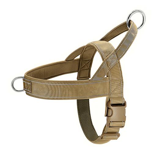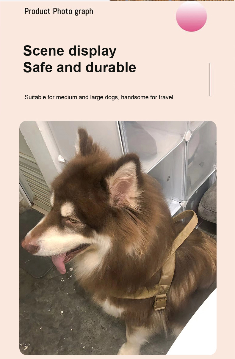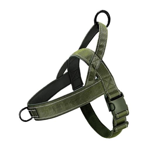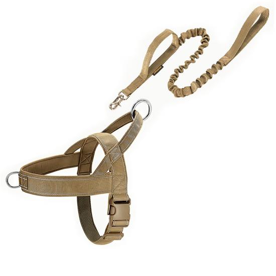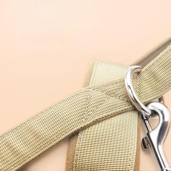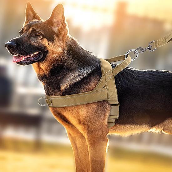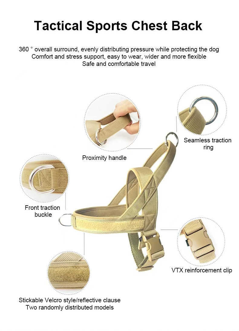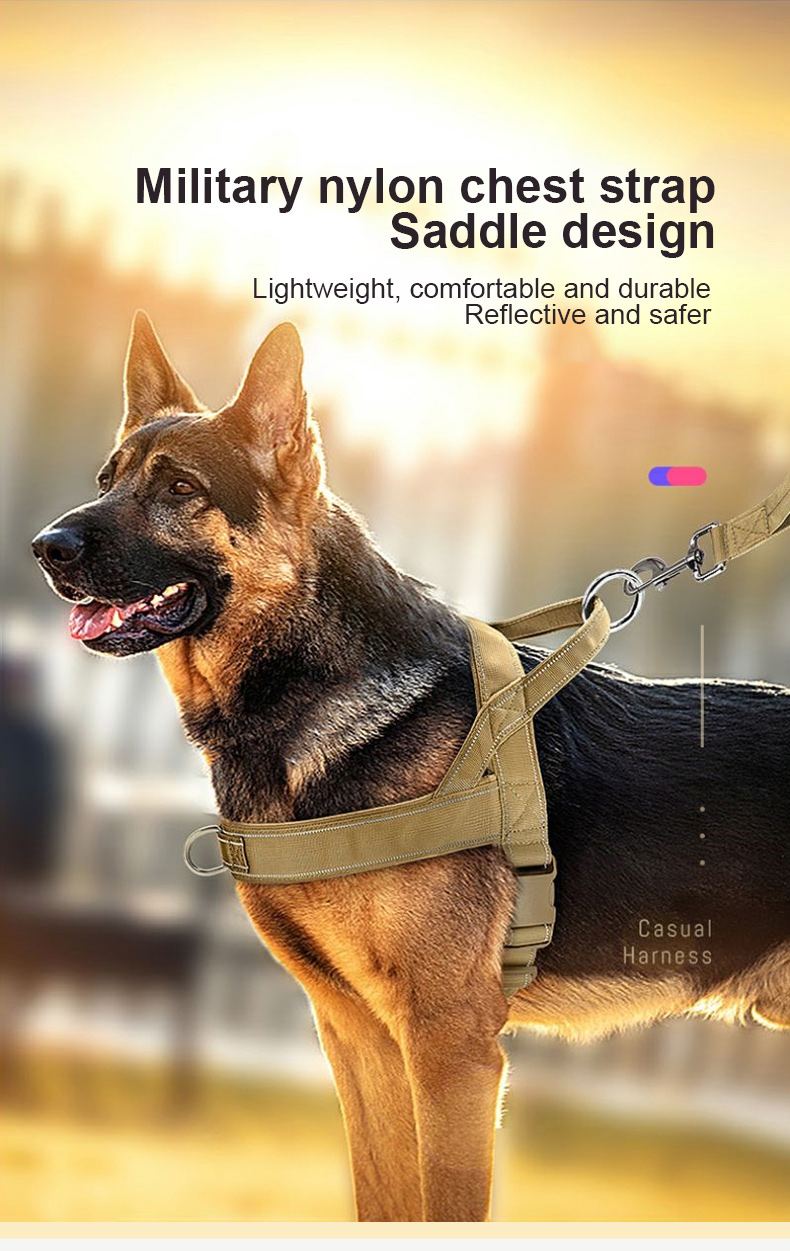 This tactical dog harness and leash set is made of high-strength nylon webbing, designed for military-style durability and control. The adjustable harness features sturdy metal D-rings for secure leash attachment, while the padded handle on the matching leash ensures comfortable grip during training or outdoor activities. The military green color offers a rugged, functional look, ideal for working dogs, training sessions and outdoor adventures. Support custom logo and wholesale orders.