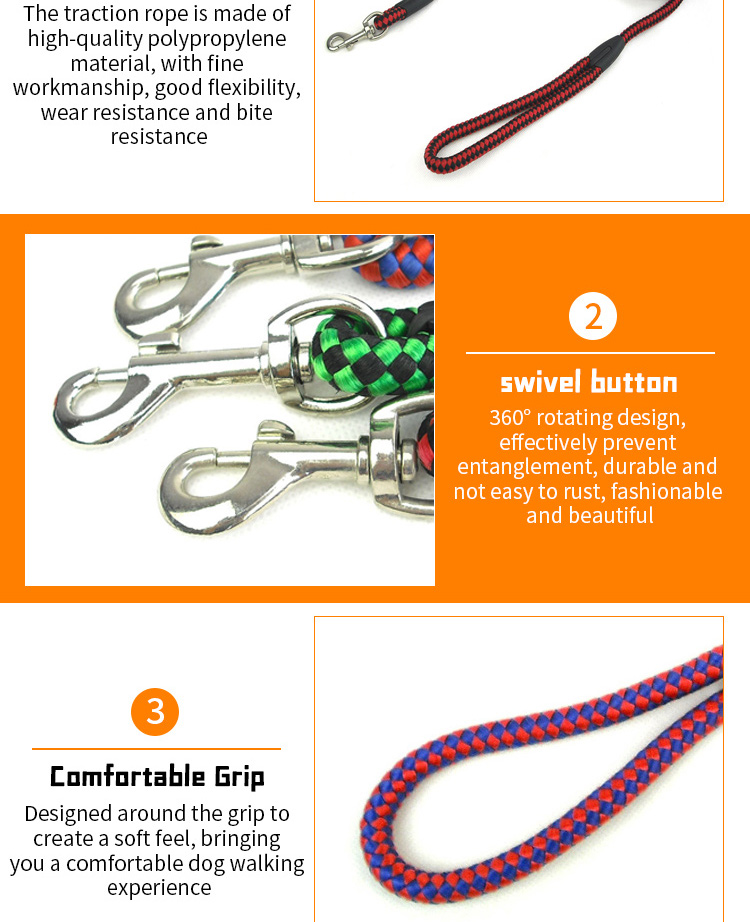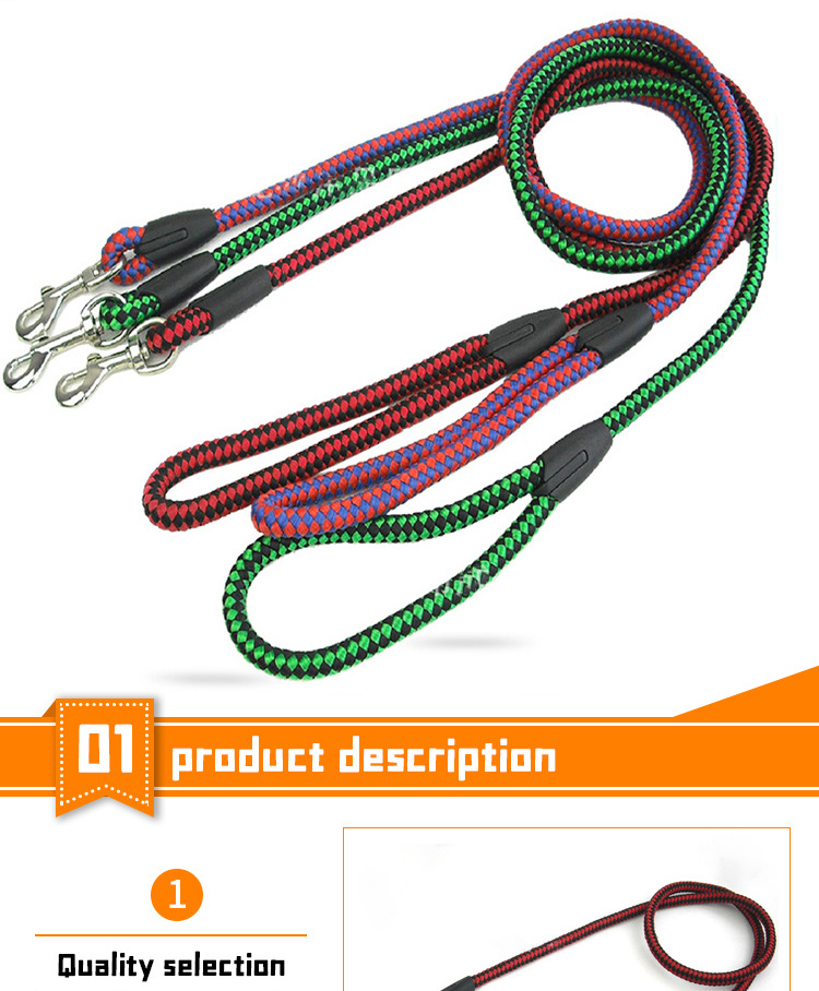 This two-tone reflective dual-handle dog leash is made of high-tensile, wear-resistant nylon webbing, embedded with high-intensity reflective threads for enhanced visibility and safety during night walks. Equipped with dual soft padded handles, it offers a comfortable, non-slip grip for both long-distance daily walking and close-control training, effectively reducing hand fatigue. The heavy-duty swivel metal clasp prevents tangling and ensures a secure attachment to your dog's collar or harness, perfect for medium and large dogs, especially those with strong pulling habits. Ideal for daily walking, training, hiking and other outdoor activities. Support custom size, color, logo and wholesale orders.